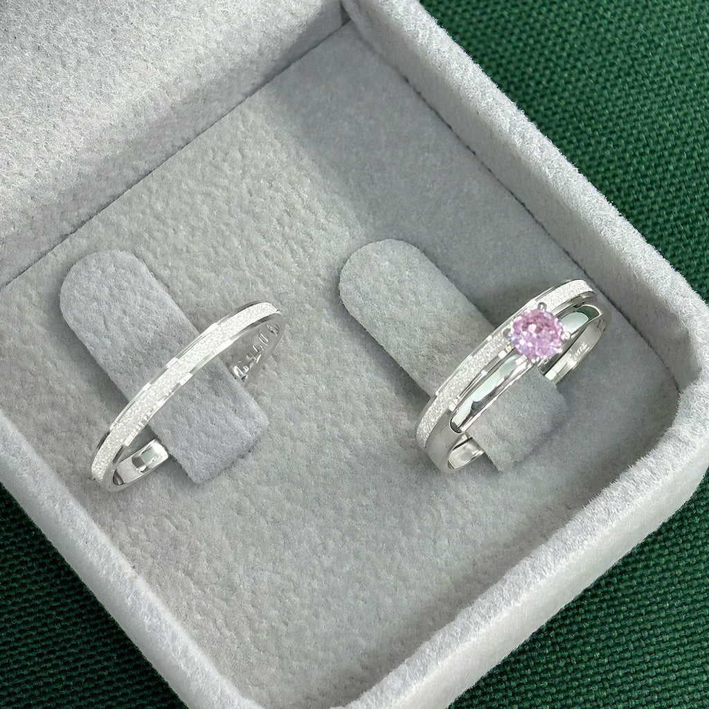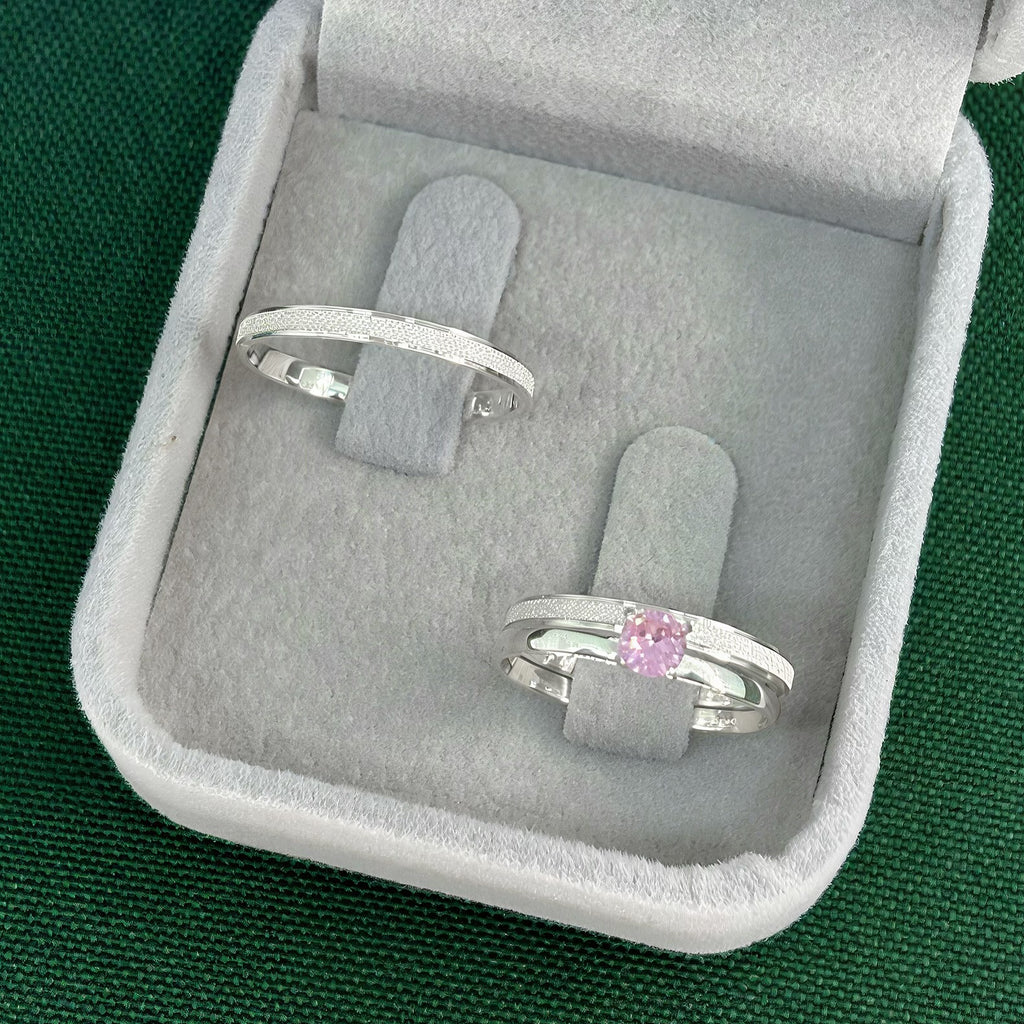Os detalhes laterais representam os caminhos trilhados juntos, enquanto o diamantado simboliza a luz e a intensidade do amor. A pedra rosa no anel solitário acrescenta um toque romântico, refletindo doçura e cumplicidade.