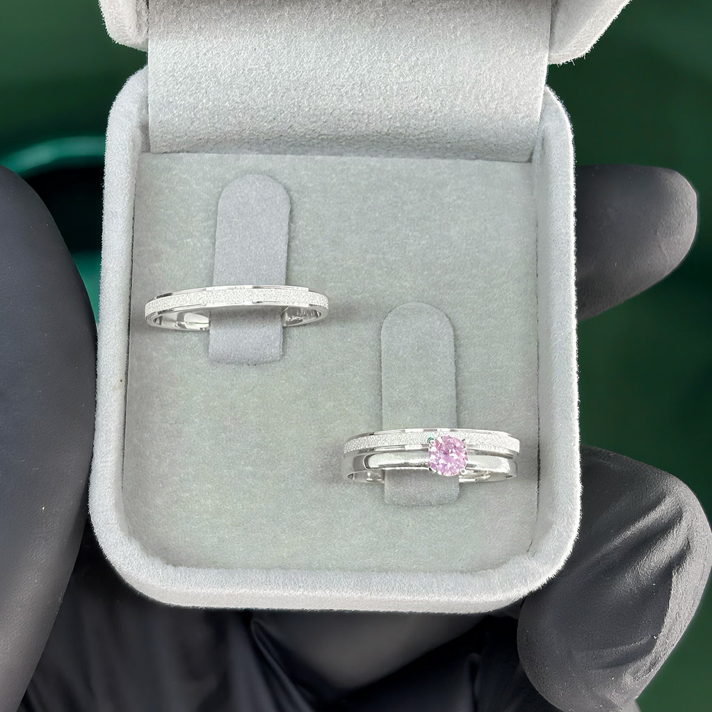 As Alianças Constantine 2mm combinam um design refinado e texturas marcantes, trazendo um toque diferenciado ao clássico. Com acabamento diamantado e detalhes nas laterais, esse modelo une brilho e sofisticação na medida certa. Para complementar o conjunto, o anel solitário feminino possui uma pedra rosa delicadamente cravejada, adicionando um charme especial à composição.