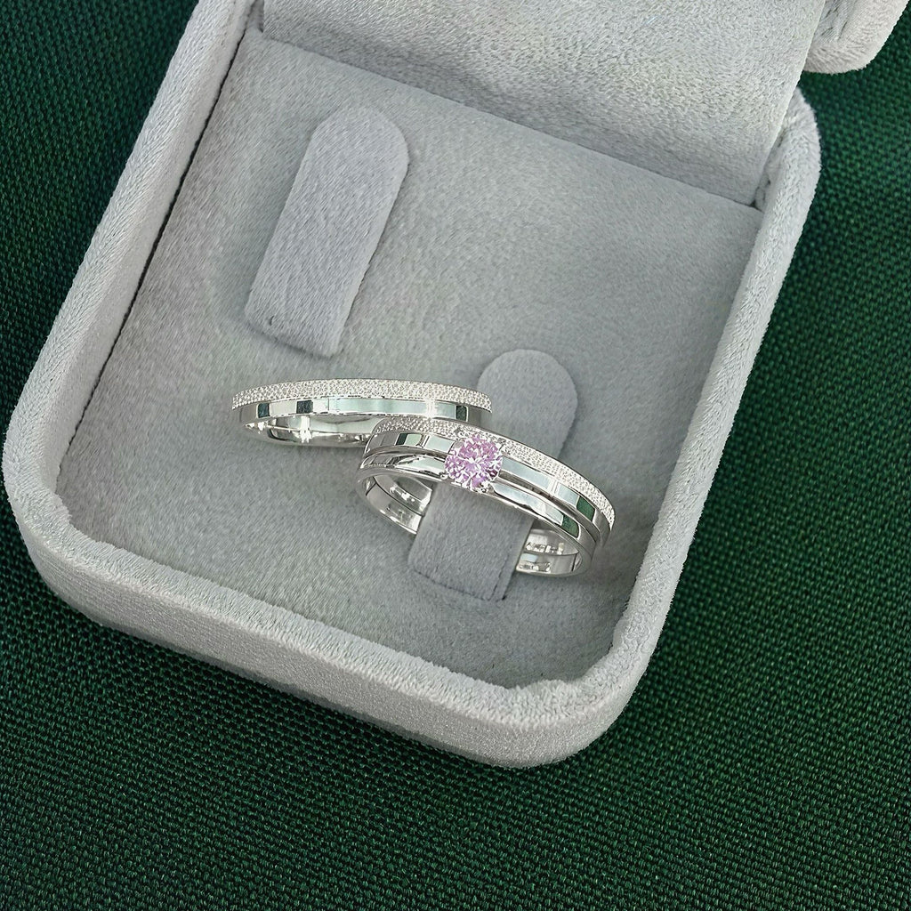 As Alianças Olimpo 2,5mm apresentam um design sofisticado, combinando acabamento metade liso e metade diamantado, proporcionando um contraste refinado. A versão feminina acompanha um Anel Solitário tradicional, cravejado com uma zircônia rosa-claro, trazendo um toque de romantismo e exclusividade.