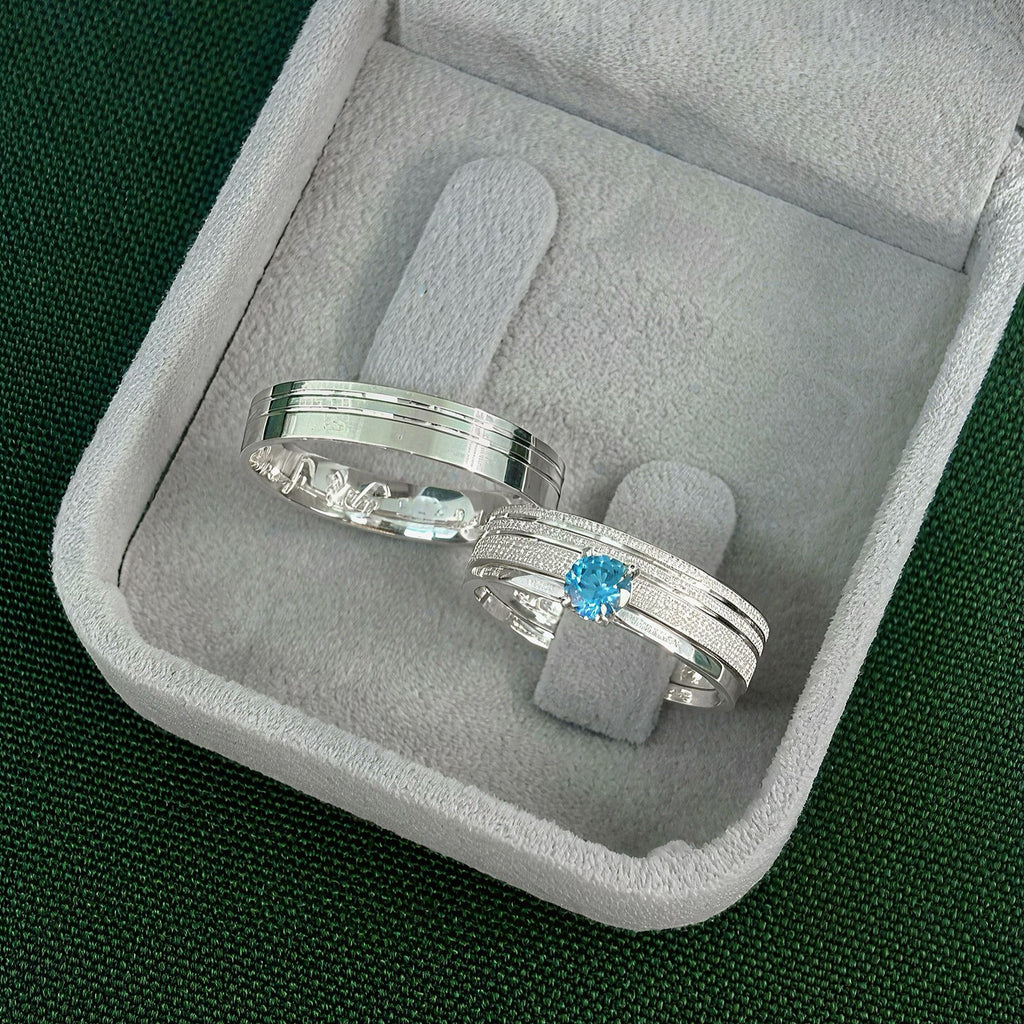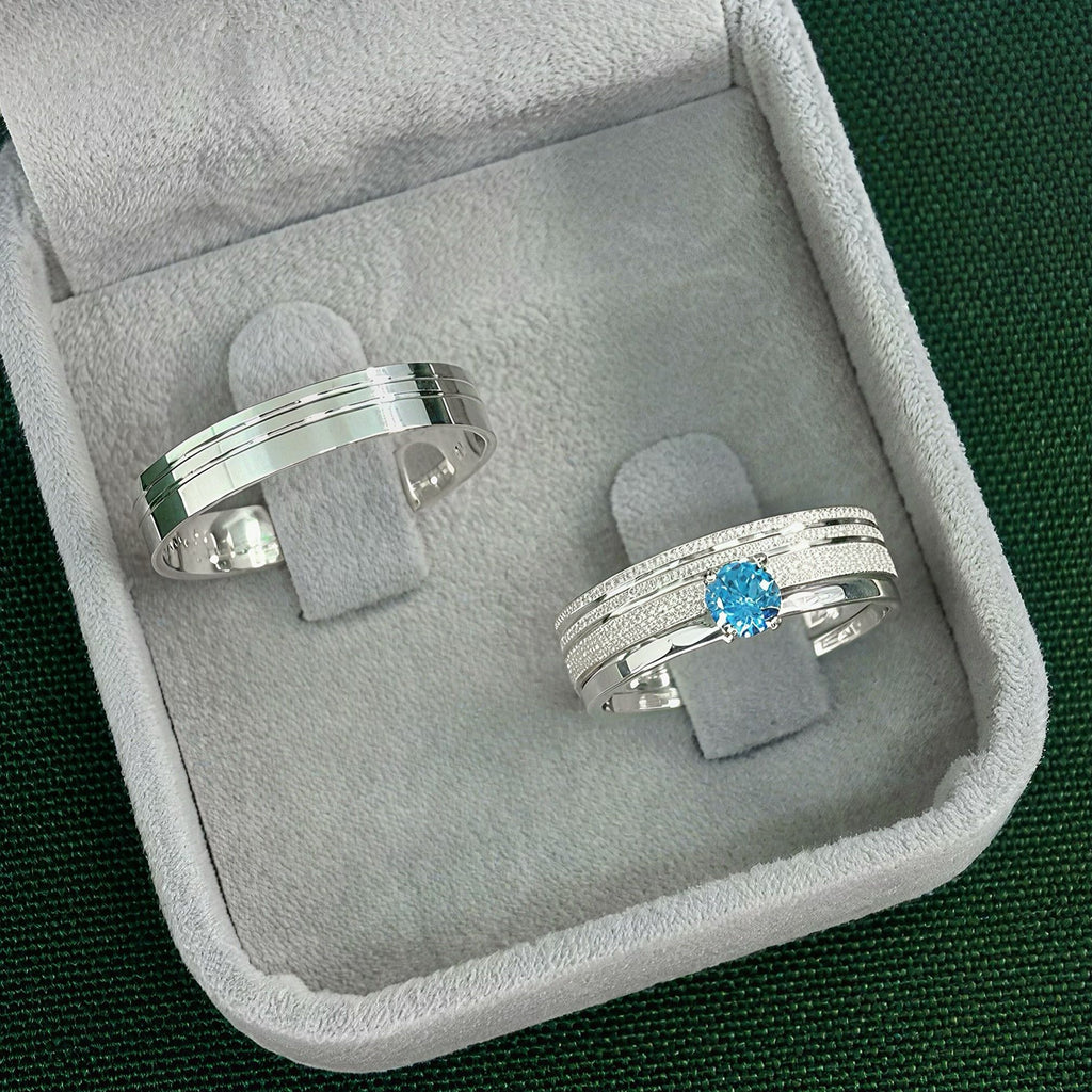 Com 4mm de largura, as Alianças Prestígio combinam modernidade e requinte. A versão masculina possui acabamento liso, garantindo um visual clássico e imponente, enquanto a versão feminina traz um acabamento diamantado que realça seu brilho sofisticado. O detalhe dos dois frisos nas laterais adiciona um toque exclusivo, e o anel solitário, com sua pedra azul-claro, completa o conjunto com um charme especial.