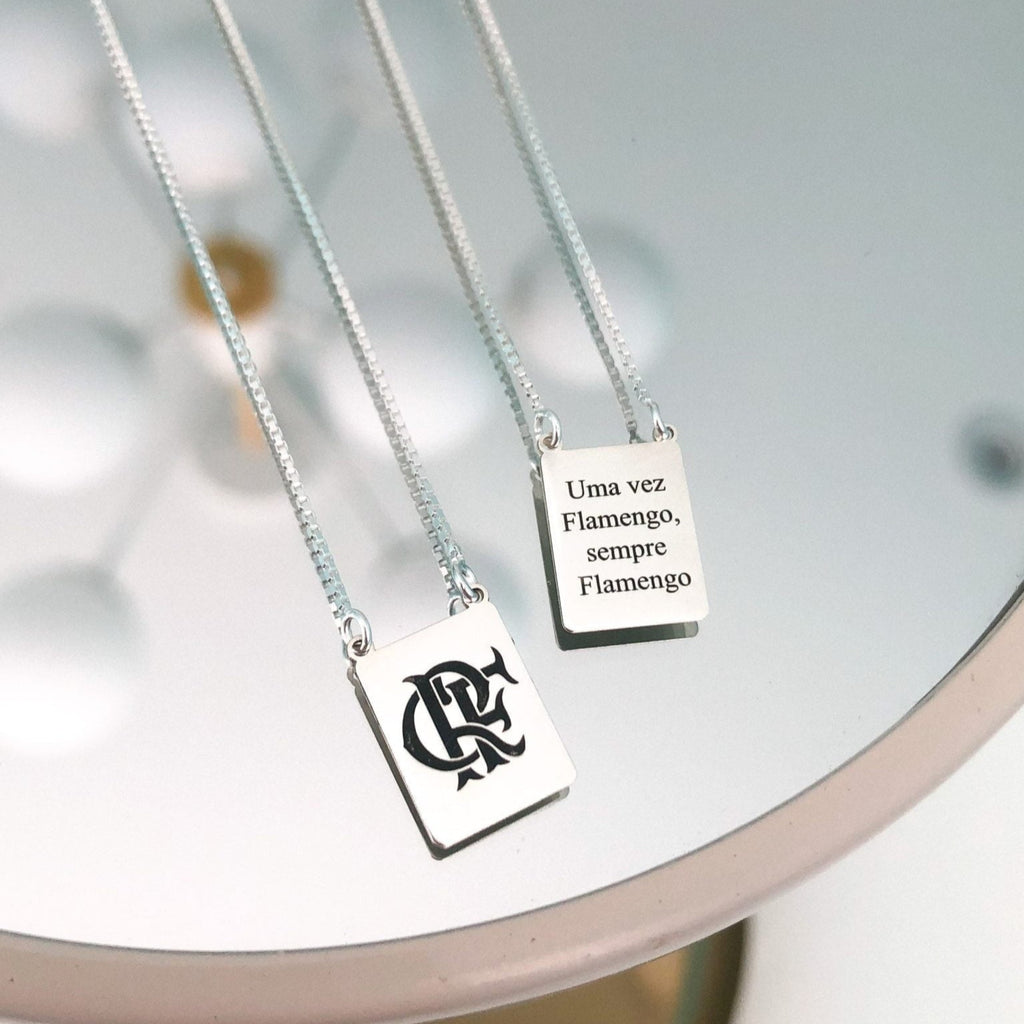 Uma peça feita para quem carrega o amor pelo time até o último minuto. Esse escapulário personalizável permite gravar o escudo do seu clube de coração de um lado e uma frase significativa do outro, como no modelo de referência: