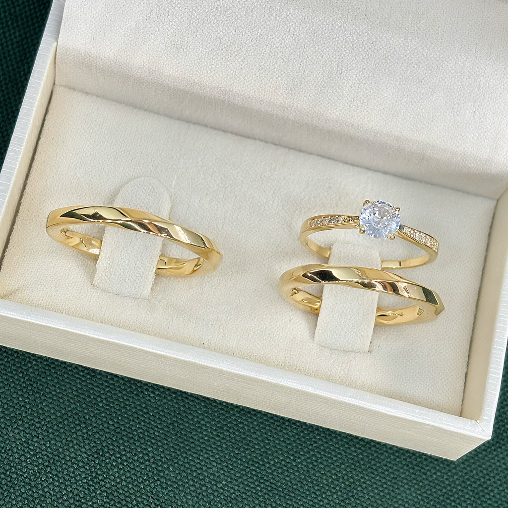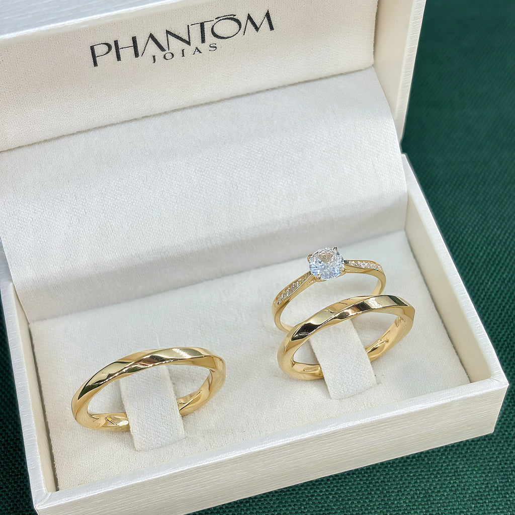 As Alianças Tansy 2,5mm encantam com seu design torcido, proporcionando delicadeza ao conjunto. São joias lisas, leves e sofisticadas, com acabamento elegante e brilho suave. A versão feminina acompanha um anel solitário cravejado com zircônia, reforçando a proposta romântica e marcante. O banho de ouro 18K traz um toque especial de luxo e calor à peça.