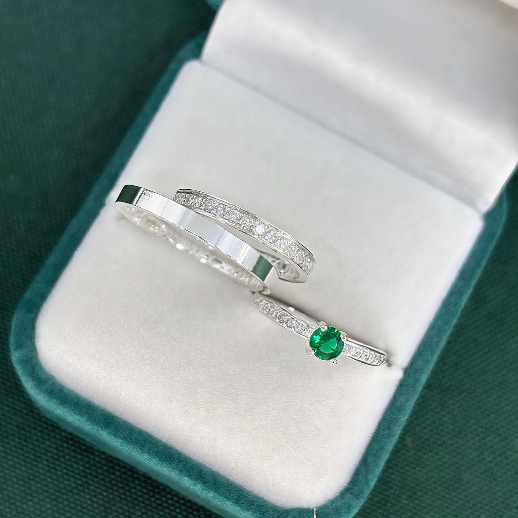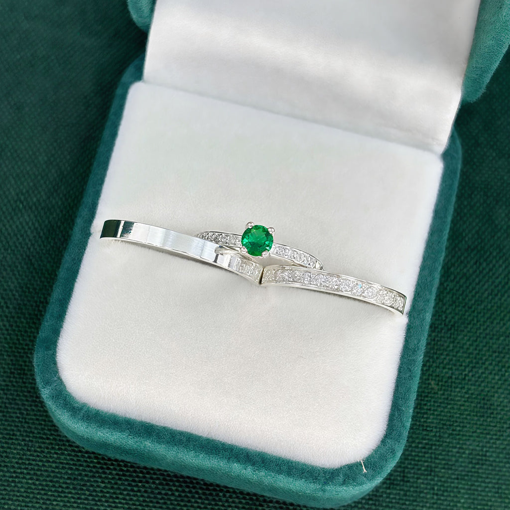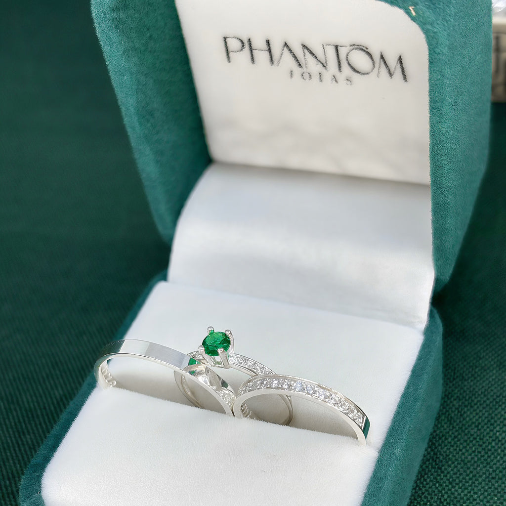 Acompanha um anel solitário cravejado com uma deslumbrante pedra verde, símbolo de esperança, equilíbrio e renovação — um conjunto perfeito para marcar momentos inesquecíveis.