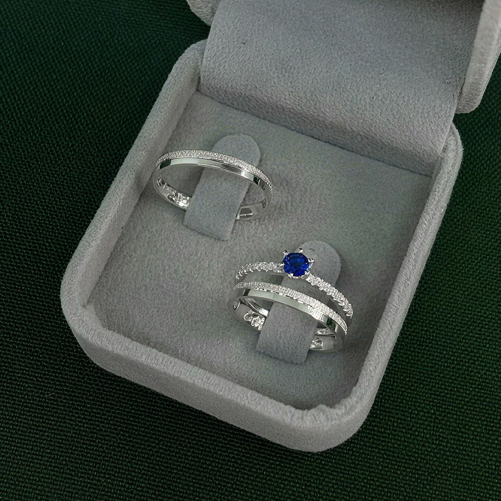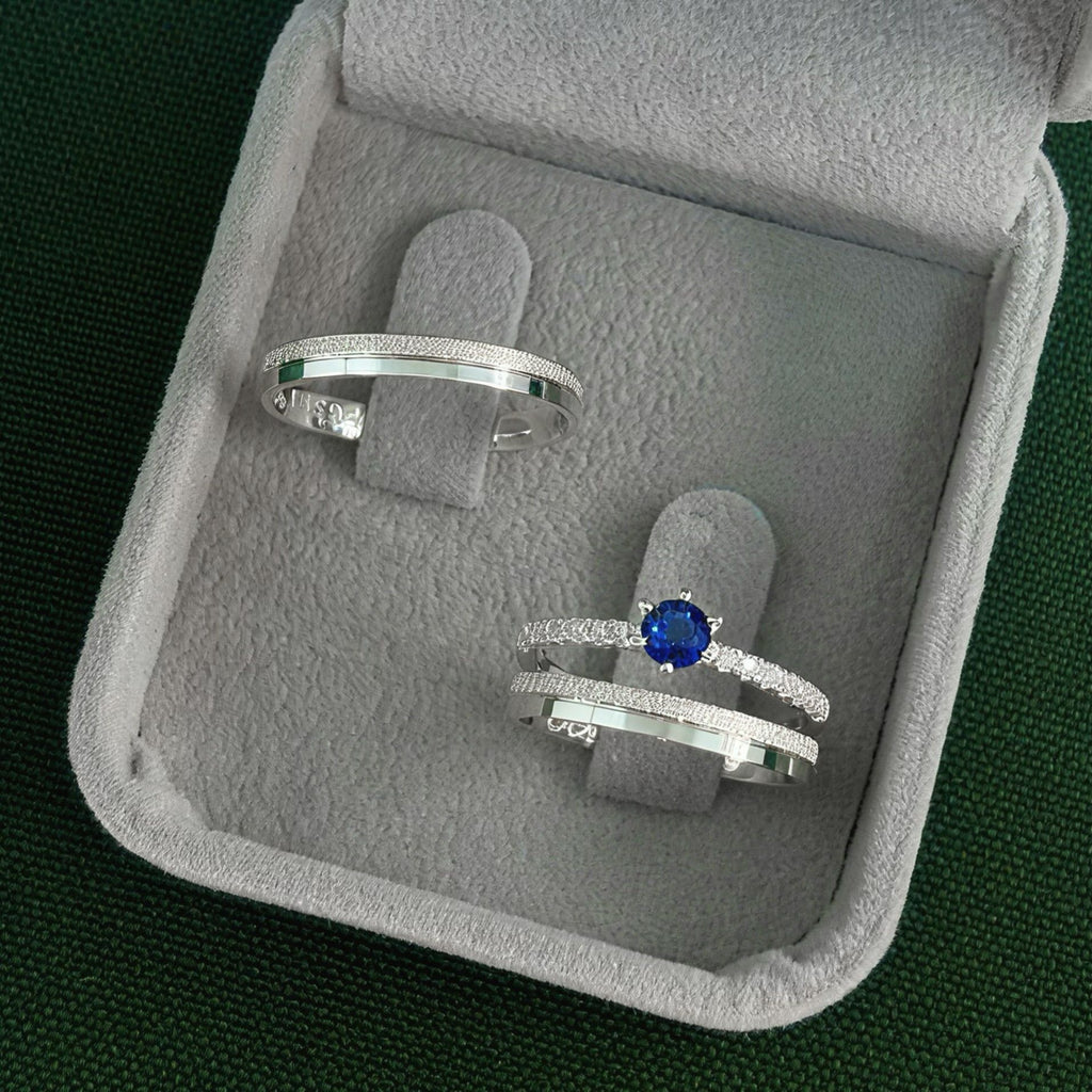 As Alianças Avelino 2,5mm apresentam um design contemporâneo dividido entre simplicidade e sofisticação. Cada aliança possui uma metade lisa e outra metade cravejada, criando um visual moderno que complementa perfeitamente o anel solitário cravejado com pedra azul claro.