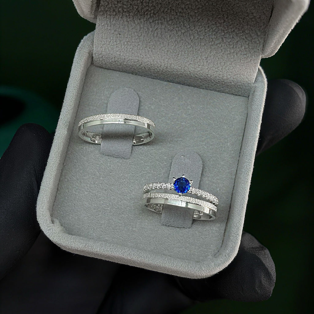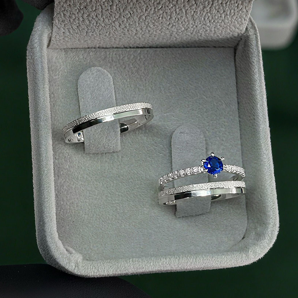 A parte lisa representa a essência pura do amor, enquanto o cravejamento simboliza os momentos especiais da relação. O azul do solitário acrescenta harmonia e serenidade a essa união.