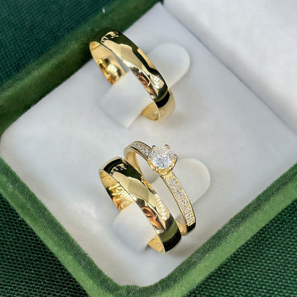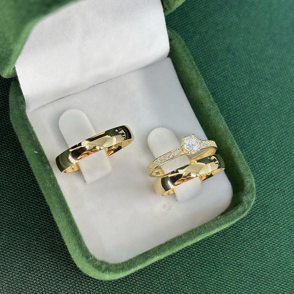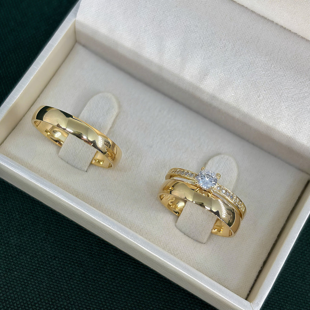 As Alianças Laços 4mm encantam pela simplicidade elegante: lisas, abauladas e com um brilho que transmite leveza. O conjunto acompanha um anel solitário cravejado com zircônias, trazendo ainda mais romantismo e sofisticação. Uma escolha delicada e atemporal para marcar o início de uma nova fase.