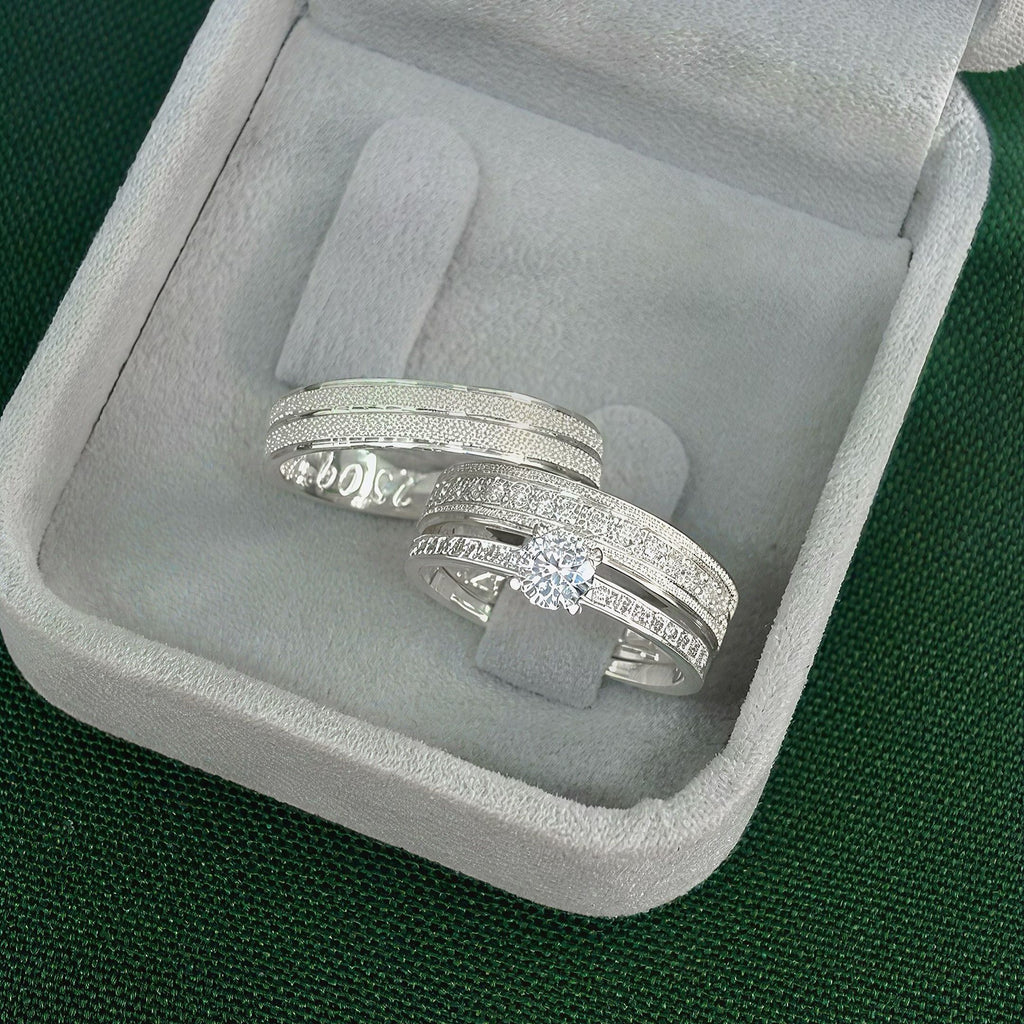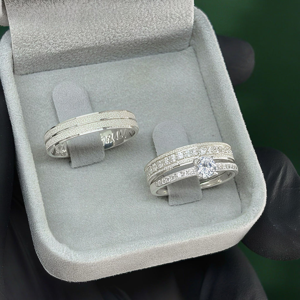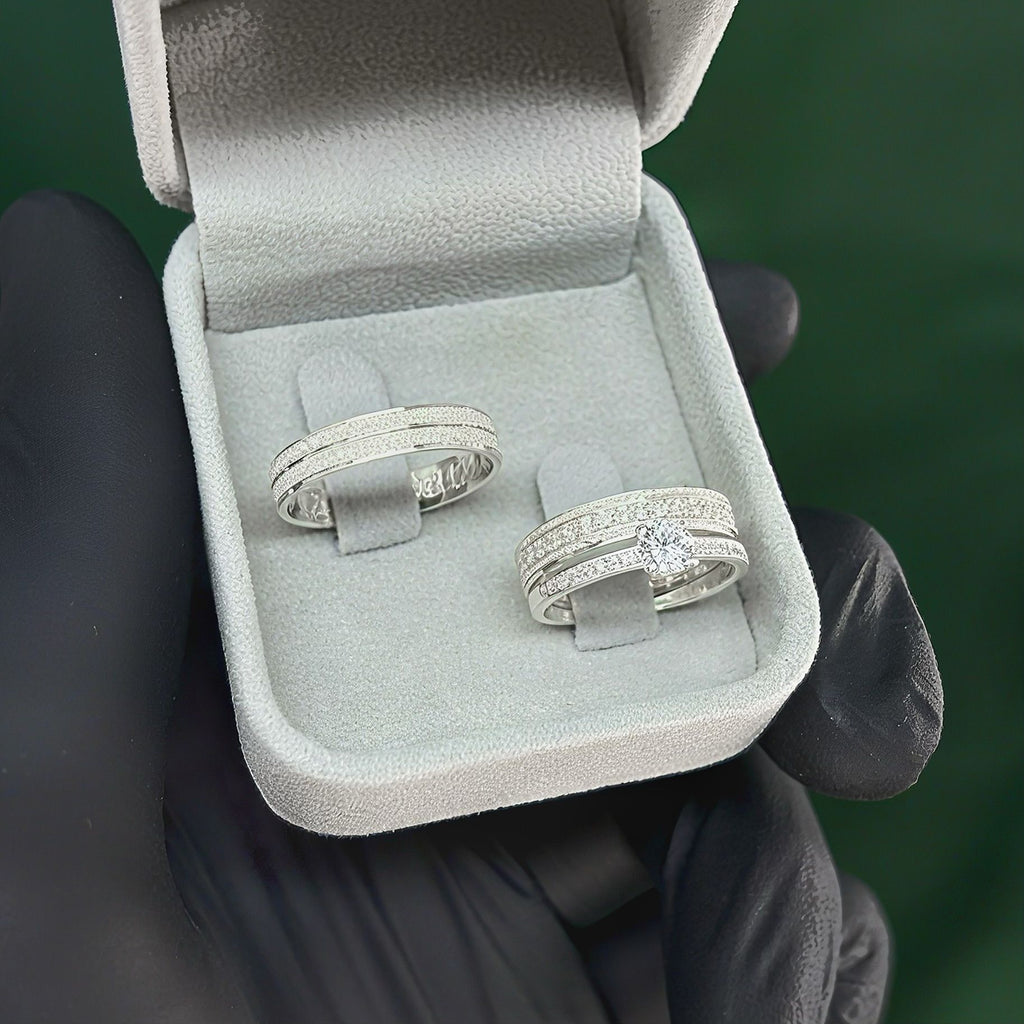 As Alianças Aurion foram pensadas para casais que valorizam a beleza atemporal com um toque especial. Ambas possuem laterais lisas e um friso central marcante, enquanto o modelo feminino se destaca por um cravejado delicado no centro. Para completar o conjunto, acompanha um Anel Solitário Cravejado que reforça a elegância da composição.